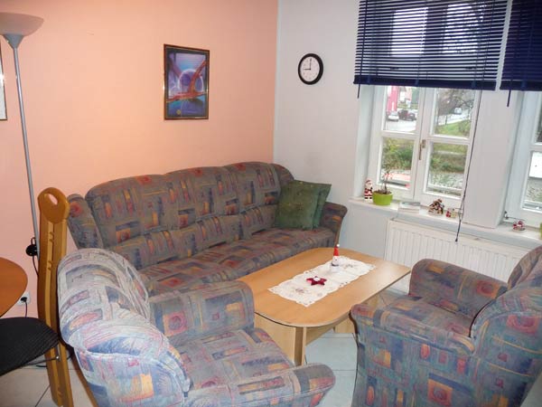 Im Wohnzimmer findet man eine gut ausgestattete Küchenzeile incl. aller Elektrogeräte sowie einen SAT - TV der neusten Generation.
