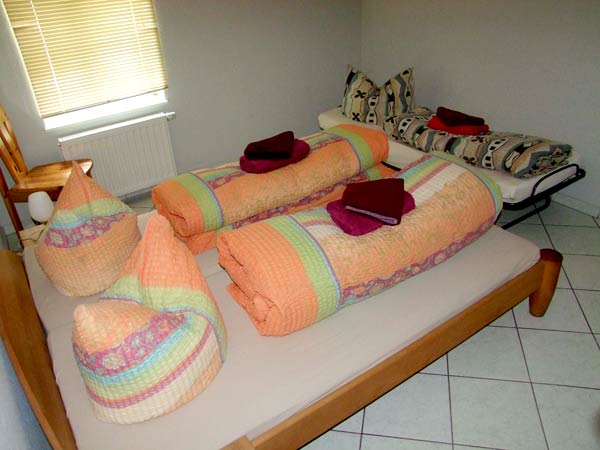 Die Ferienwohnung 5 besteht aus zwei Schlafräumen mit jeweils einem Doppelbett für 2 Personen sowie einer Aufbettungsmöglichkeit durch eine Schlafcouch, Zustell- oder Kinderbett.